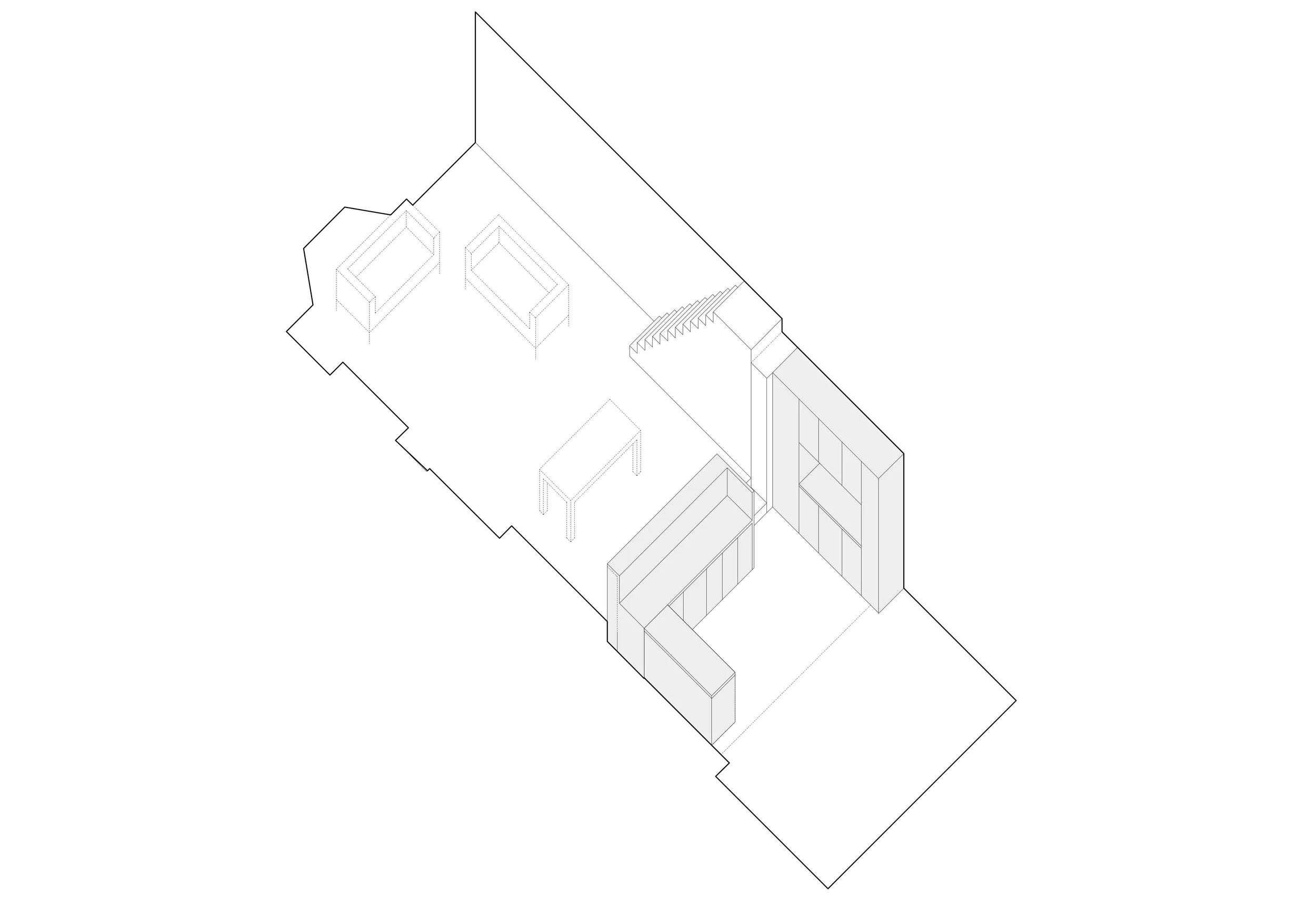 While autonomous materially, interior components of the scheme are articulated as smaller-scale sculptural elements, related to the asymmetric, rectilinear geometry of the large-scale sculptural moves of the exterior. Recalling the Skyspaces of the artist James Turrell, the glass roof to the shower replaces the materiality of a ceiling with the immateriality of the sky.